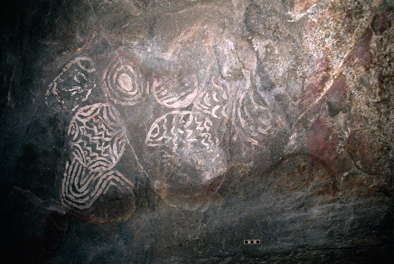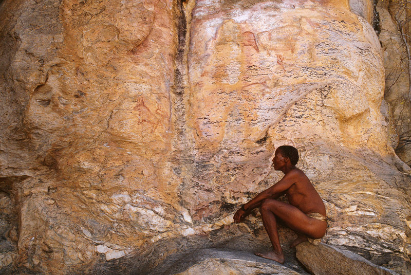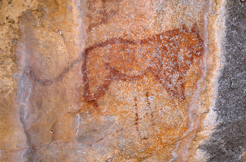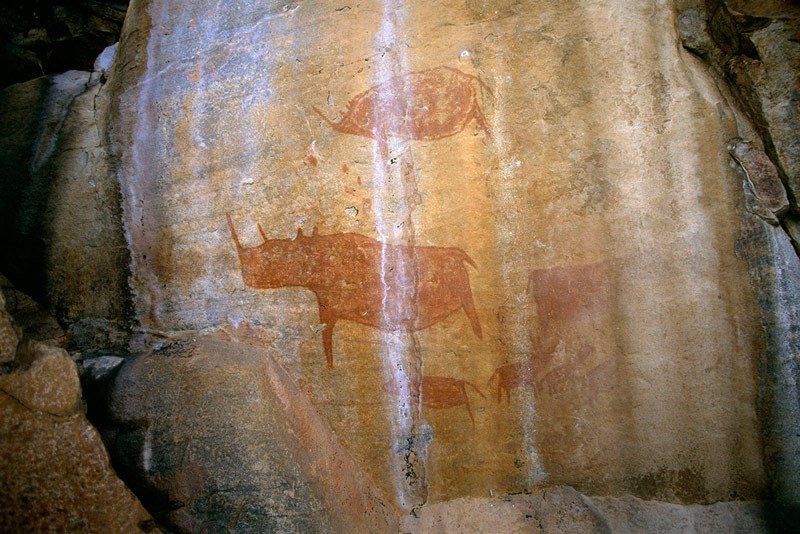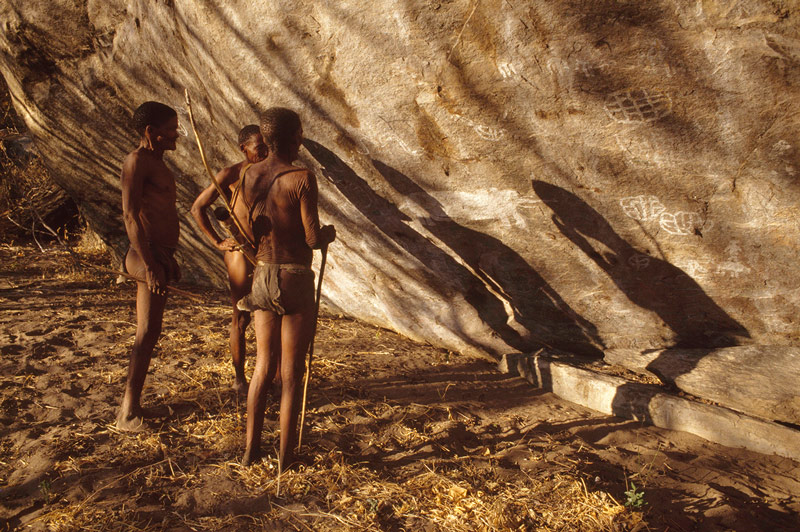 This is where the Tsodilo Hills are located, now a World Heritage rock art site where some 4,500 paintings have so far been recorded. Although some of the paintings were made by San/Bushmen most are believed to have been made by Khoi (Khoe) people and also by Bantu immigrants like the Hambakush who arrived there about 1,800 years ago. It is possible that most of this art was made during the last 2,000 years. In eastern Botswana a lot of the art is San art but there is also some Khoe art in the east.